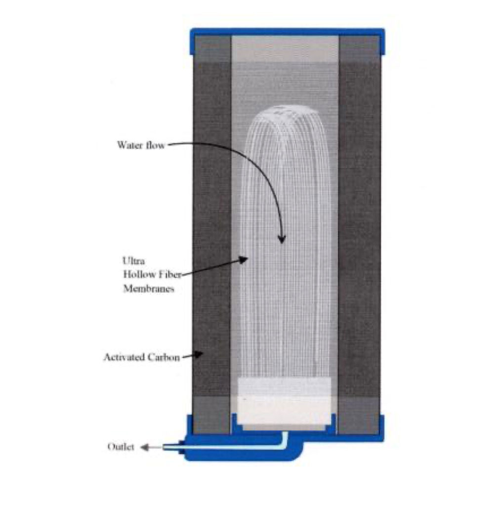 Het ultra-membraan is samengesteld uit vele zeer dunne poreuze rietjes met een porie-grootte van slechts 0.01 tot 0.03 micron, waardoor micro-organismen zoals bacteriën en protozoa worden afgevangen (bacterie-reductie > 99,9999%) alsmede micro- en nano-plastics vanaf een grootte van 0,03 micron (30 nanometers).
