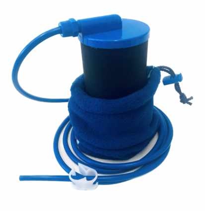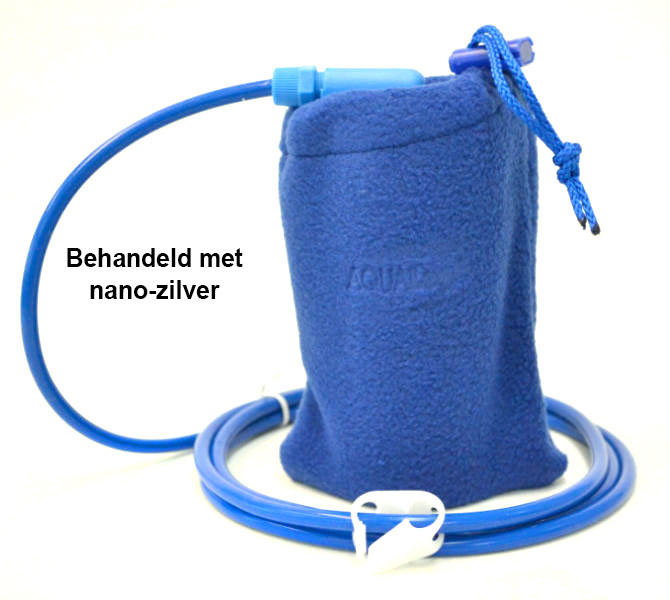 Bij gebruik van oppervlaktewater als drinkwaterbron, is het advies om de meegeleverde filterkous te gebruiken. Trek de filterkous om het filter heen en sluit deze rondom de blauwe kap goed af door het koord stevig aan te trekken.