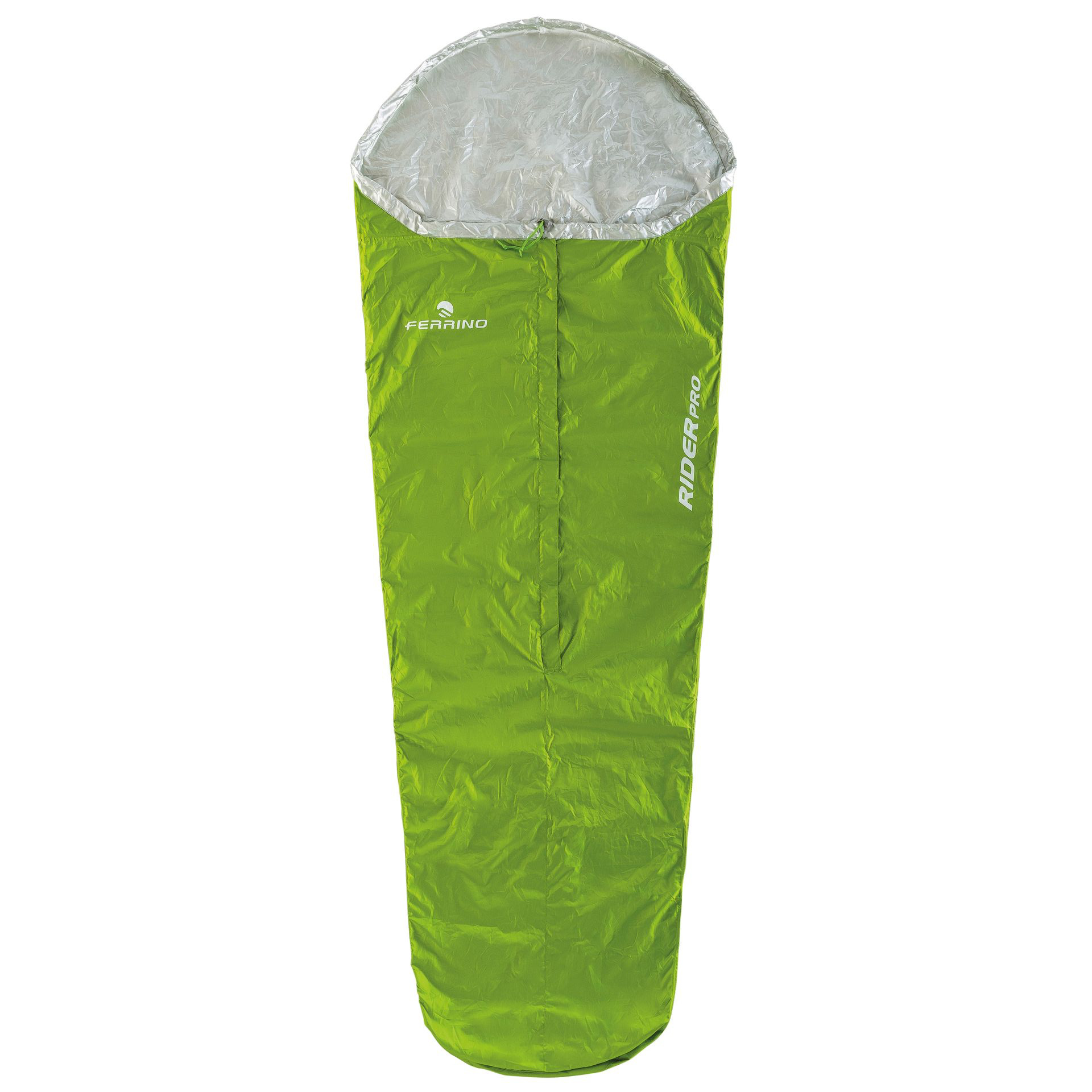 De Ferrino Rider Pro is een survival-bag of thermische cover. Het is een slaapzak in ruim uitgevoerd mummy-model die gemaakt is van ripstop polyester bekleed met warmte-reflecterend gealuminiseerd materiaal en waterproof getapede naden. Hij is voorzien van een ritssluiting in het midden op de slaapzak en een ritssluiting in het voeteneind voor extra ventilatie.