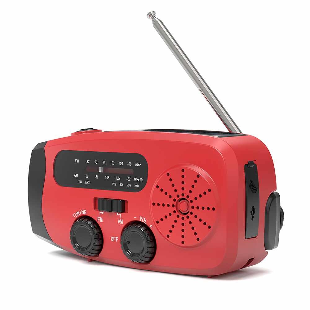 Deze noodradio is via USB op te laden en in noodsituaties met de zwengel of zonnepaneeltje bij te laden