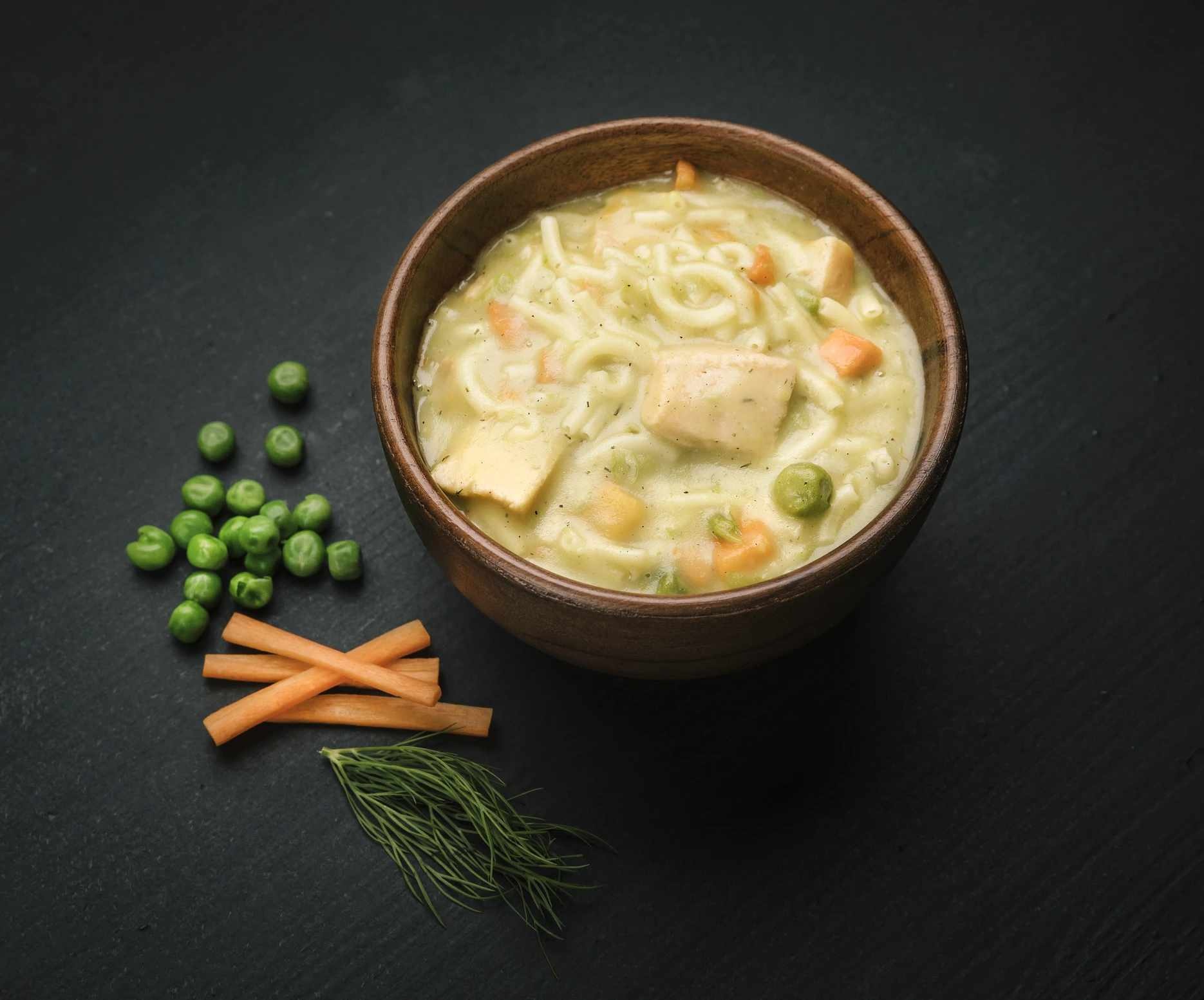 30% Deegwaren (harde tarwe), 16% visproduct van zalm (92,6% zalm, zout), 15% wortel, ui, 8% erwten, 8% room (melk), tarwemeel, koolzaadolie, maïszetmeel, visbouillon (vis, zout, maltodextrine, gistextract, groenten, koolzaadolie, kruiden), peper, 0,04% dille, antioxidant (rozemarijnextract, ascorbinezuur), kan sporen van soja bevatten.