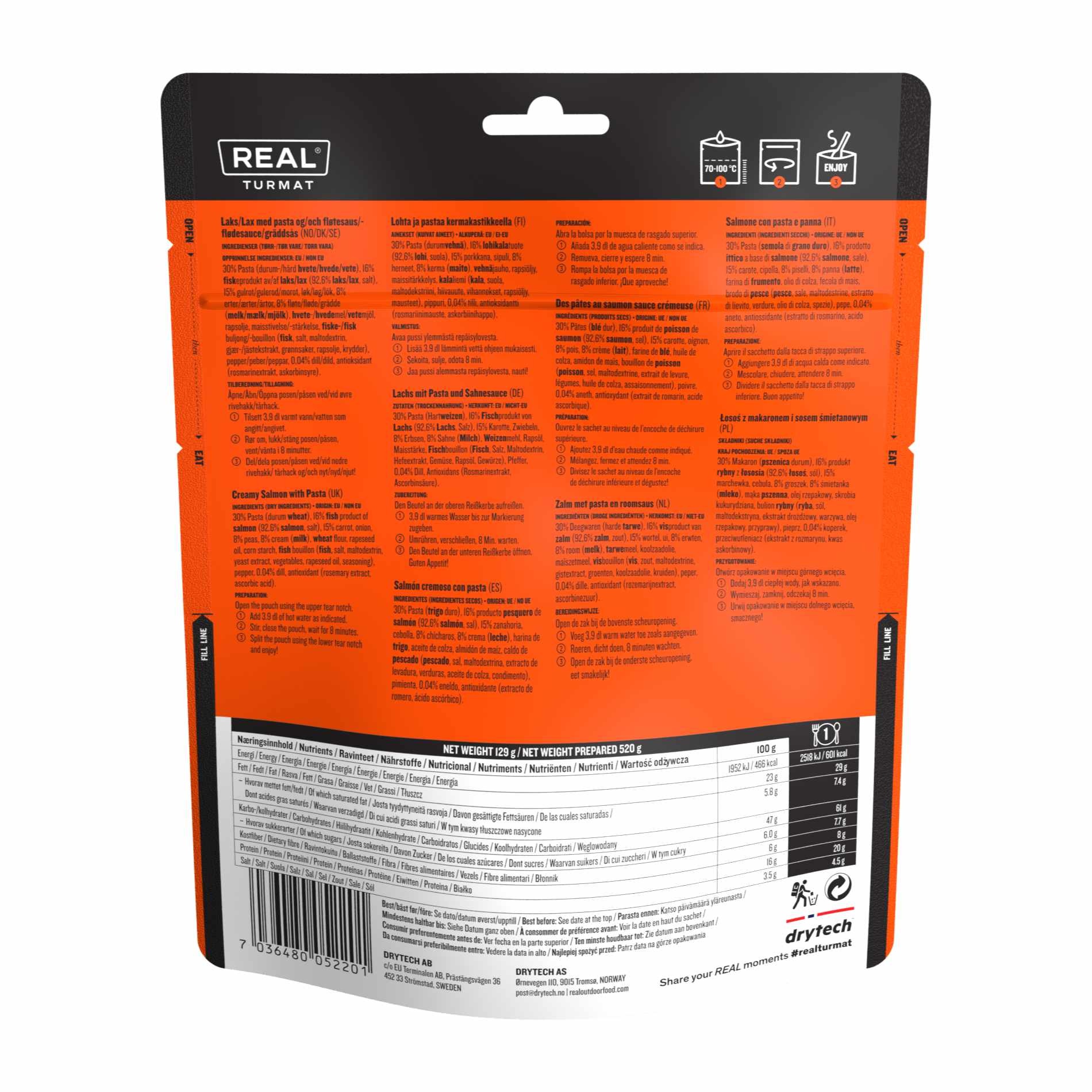REAL Turmat Romige Zalm met Pasta is een hartverwarmende gevriesdroogde maaltijd, gemaakt voor de bergen, de kust en alles daartussenin. Het gerecht is bereid met Noorse zalm. De saus is zijdezacht en rijk, en geeft een gevoel dat vergelijkbaar is met een carbonara.
