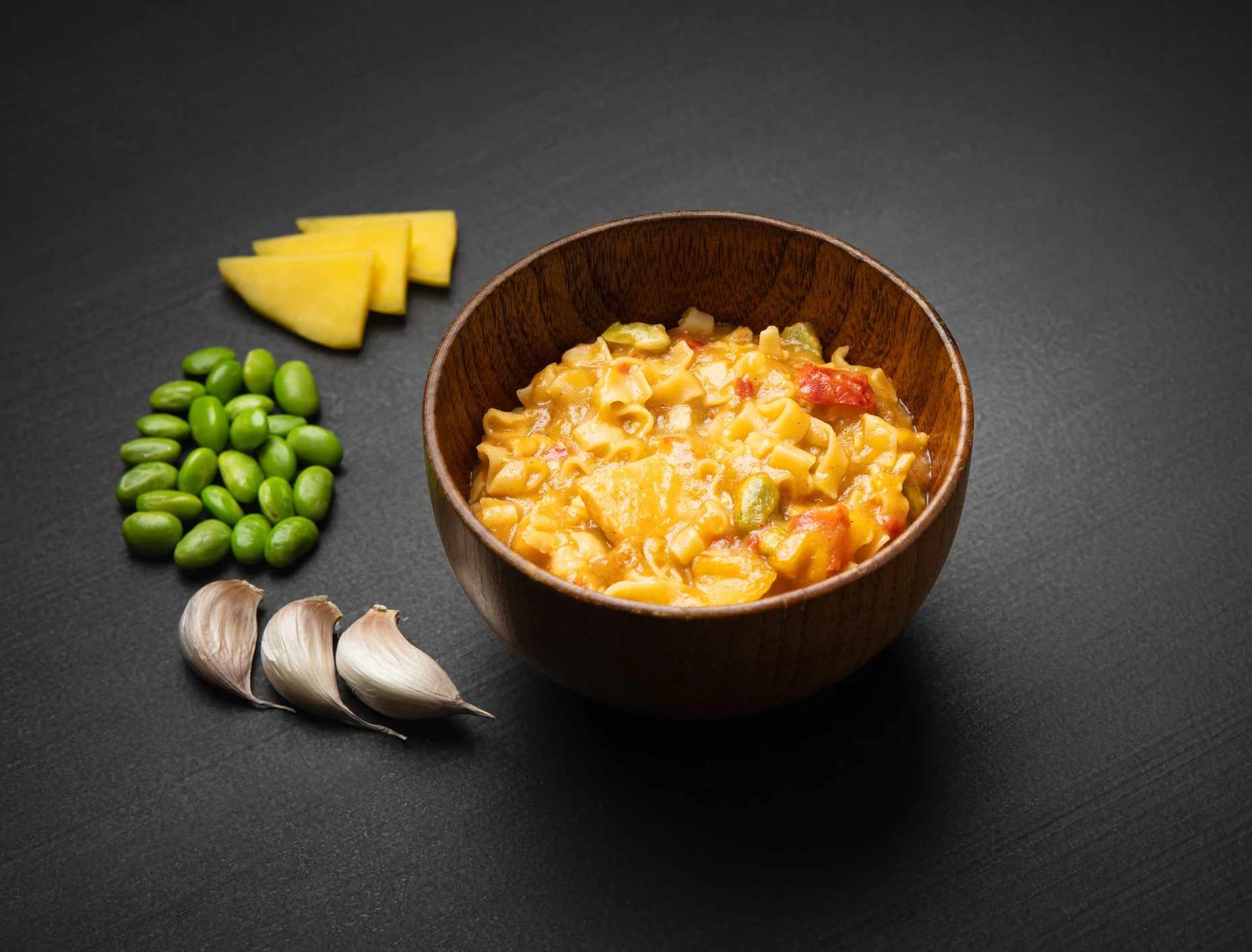 Noedel (harde tarwe), 16% visproduct van zalm (92,6% zalm, zout), kokosmelk, paprika, 7% mango, 5,5% edamame (soja), sojasaus (soja, zout, azijn), koolzaadolie, maïszetmeel, bruine suiker, limoensap, gember, 1,4% knoflook, kruiden, gistextract (gistextract, zout), antioxidant (rozemarijnextract, ascorbinezuur).